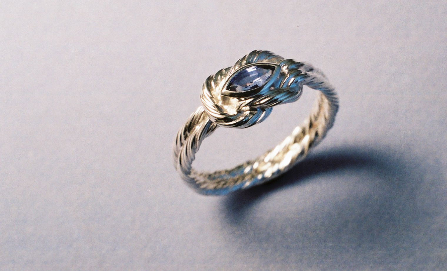 25th Silver Anniversary ring. A wreath knot design constructed with twenty four fine strands of sterling silver, twisted and tied together forming the knot. Centrally mounted pale blue ‘Ceylon’ sapphire, marquise cut in a rubover setting. Simple idea, tricky to make.