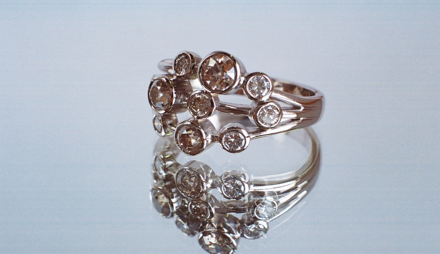 This multigem diamond 18ct white gold ring was designed to incorporate varying size stones from several old family rings. Recycling the gems helped create a ‘stacking’ style ring with a contemporary feel giving the ‘Old Cut’ diamonds a new lease of life. The white gold was left in it’s natural colour (not rhodium plate), this worked sympathetically with the tinted antique appearance of the diamonds. Diamonds were carefully arranged in a random pattern, individually mounted in rubover settings. A new family classic.
