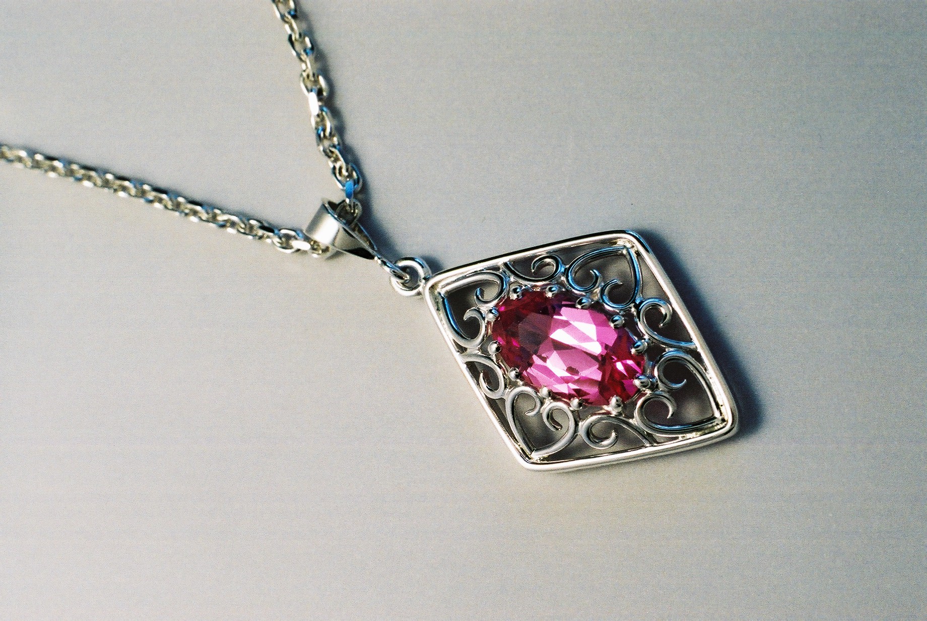 Pink Sapphire & Silver Pendant Posted on March 8, 2013 by martinberesford A specially designed silver pendant incorporating a large oval faceted pink sapphire. Traditional ‘C’ scrolls and open heart motifs combined to enhance this beautiful gem. All hand crafted including tailored twelve claw stone mount. Like Loading... Related
